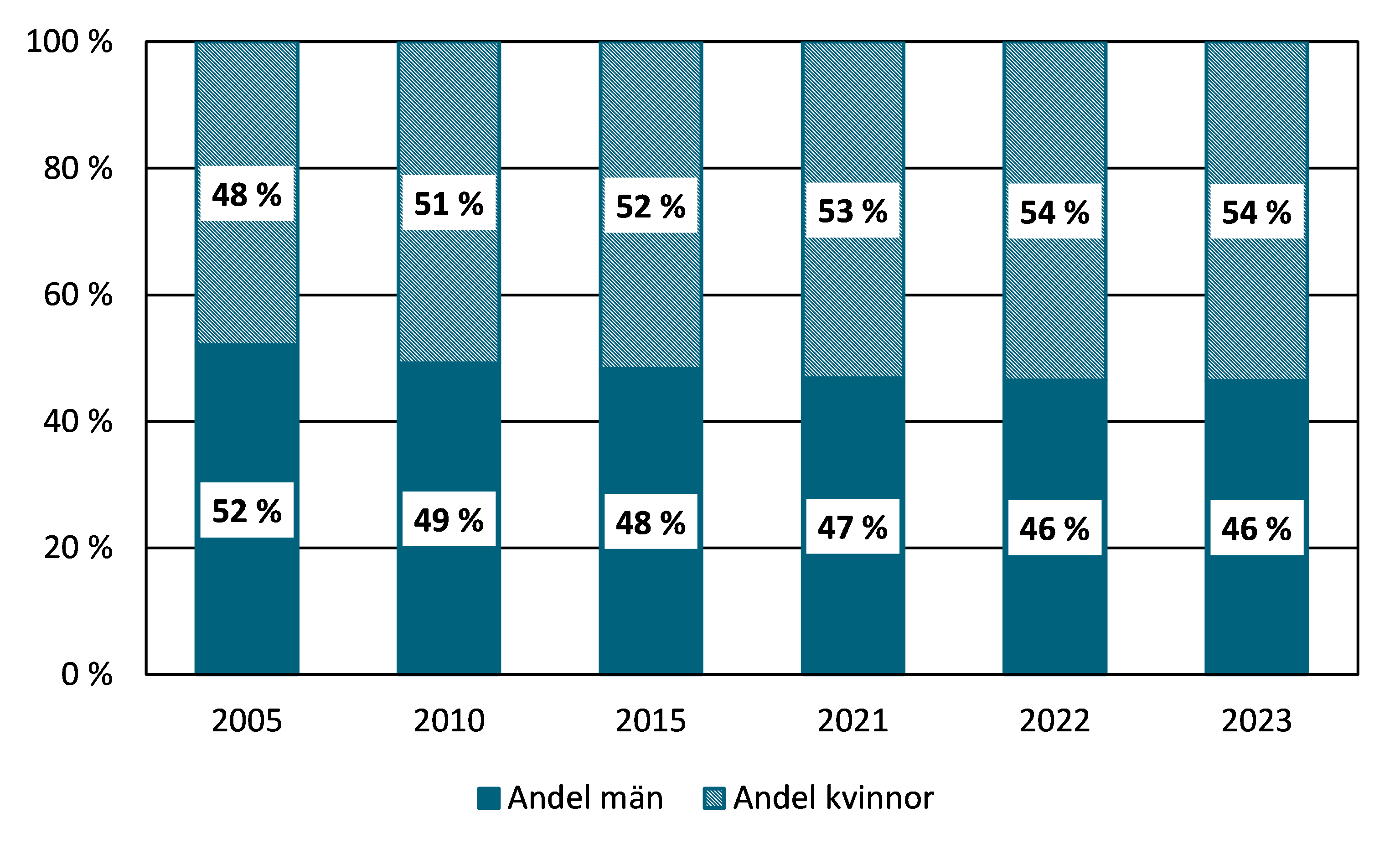 När det gäller uppgifter om könsfördelning för 2021–2023 i figuren använder vi oss av SCB:s Befolkningens arbetsmarknadsstatistik (BAS). För övriga år i figuren använder vi oss av SCB:s registerbaserade arbetsmarknadsstatistik (RAMS). Könsfördelningen i staten år 2021 var 53 procent kvinnor och 47 procent män för både RAMS och BAS. Vi redovisar uppgifter för vart femte år mellan perioden 2005–2015. För 2021 och fram redovisar vi årliga siffror.