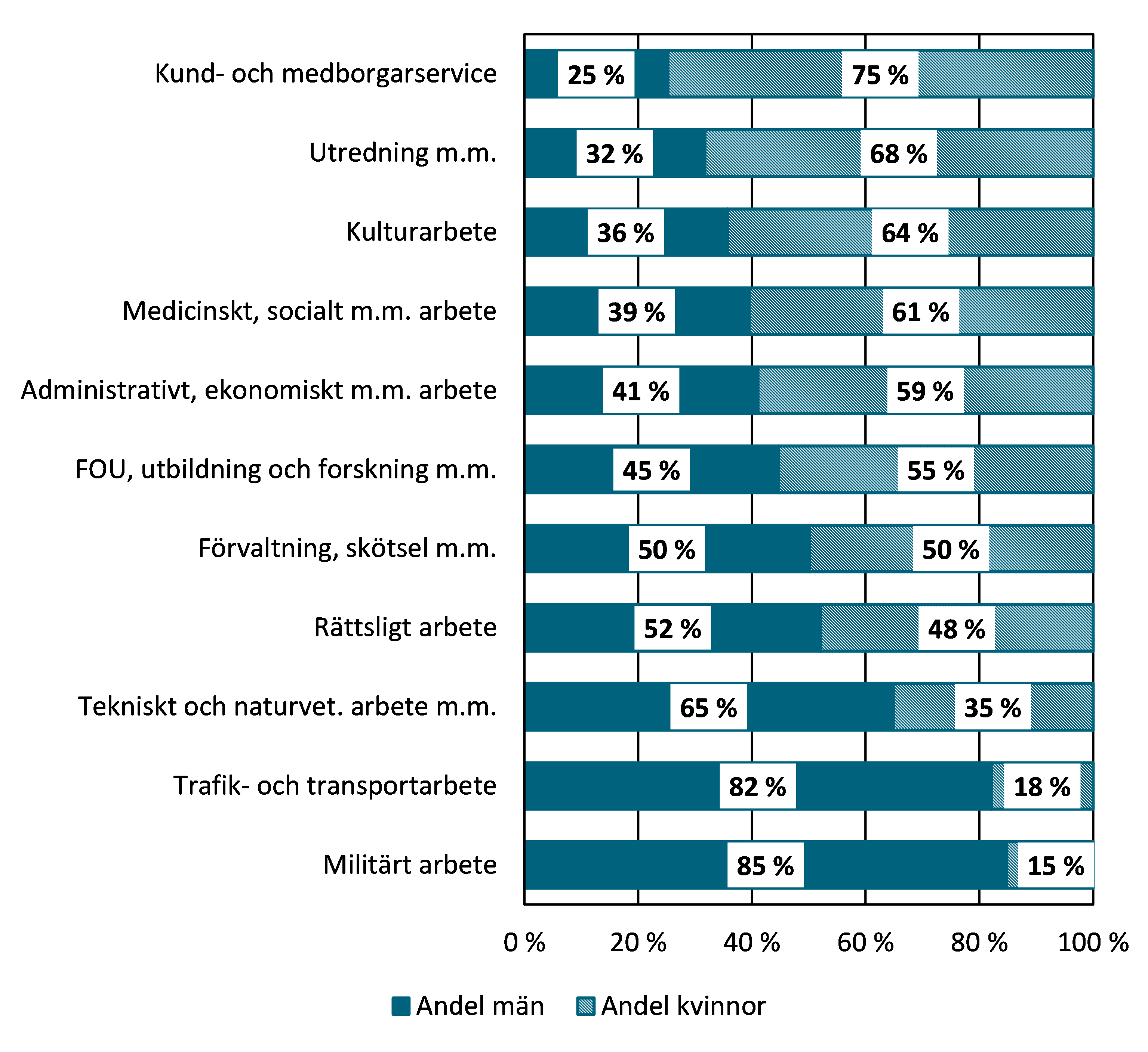 Könsfördelningen bland de anställda i myndigheter under regeringen skiljer sig åt inom olika verksamhetsområden. Den största skillnaden finns inom området militärt arbete. Där är 85 procent av de anställda män. Kvinnor är i klar majoritet inom områdena kund- och medborgarservice samt utredning. Könsfördelningen är jämnast inom områdena förvaltning och skötsel, rättsligt arbete samt forskning och utbildning.