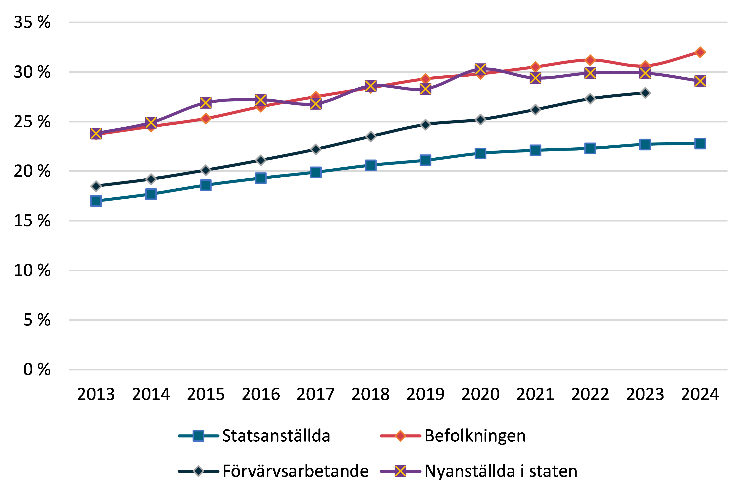Staten avser myndigheter under regeringen. Uppgifter om andel förvärvsarbetande med utländsk bakgrund 2024 fanns inte tillgängliga vid publiceringen av denna rapport.