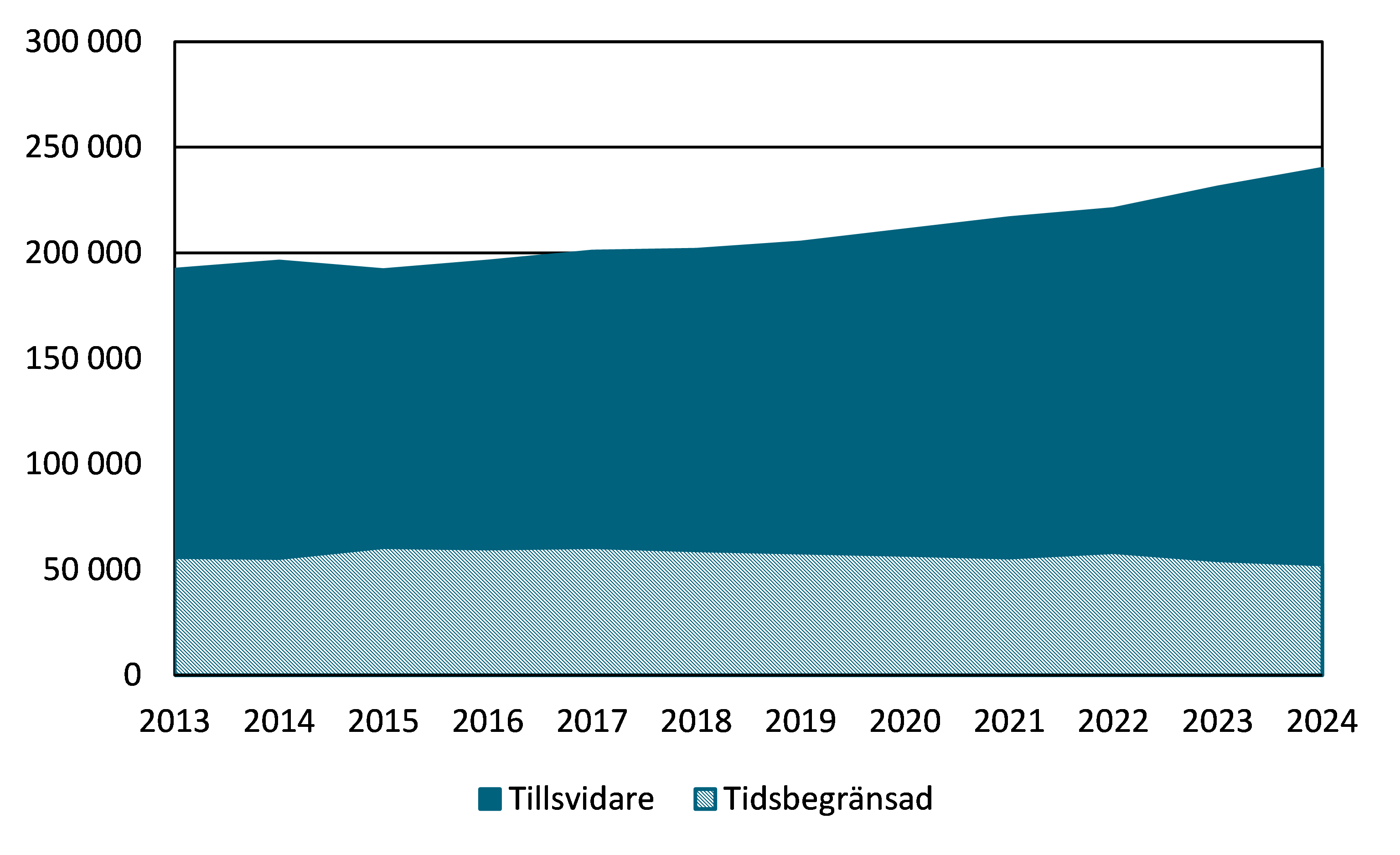 Antal tillsvidareanställda och antal med tidsbegränsad anställning i myndigheterna under regeringen, 2013–2024
