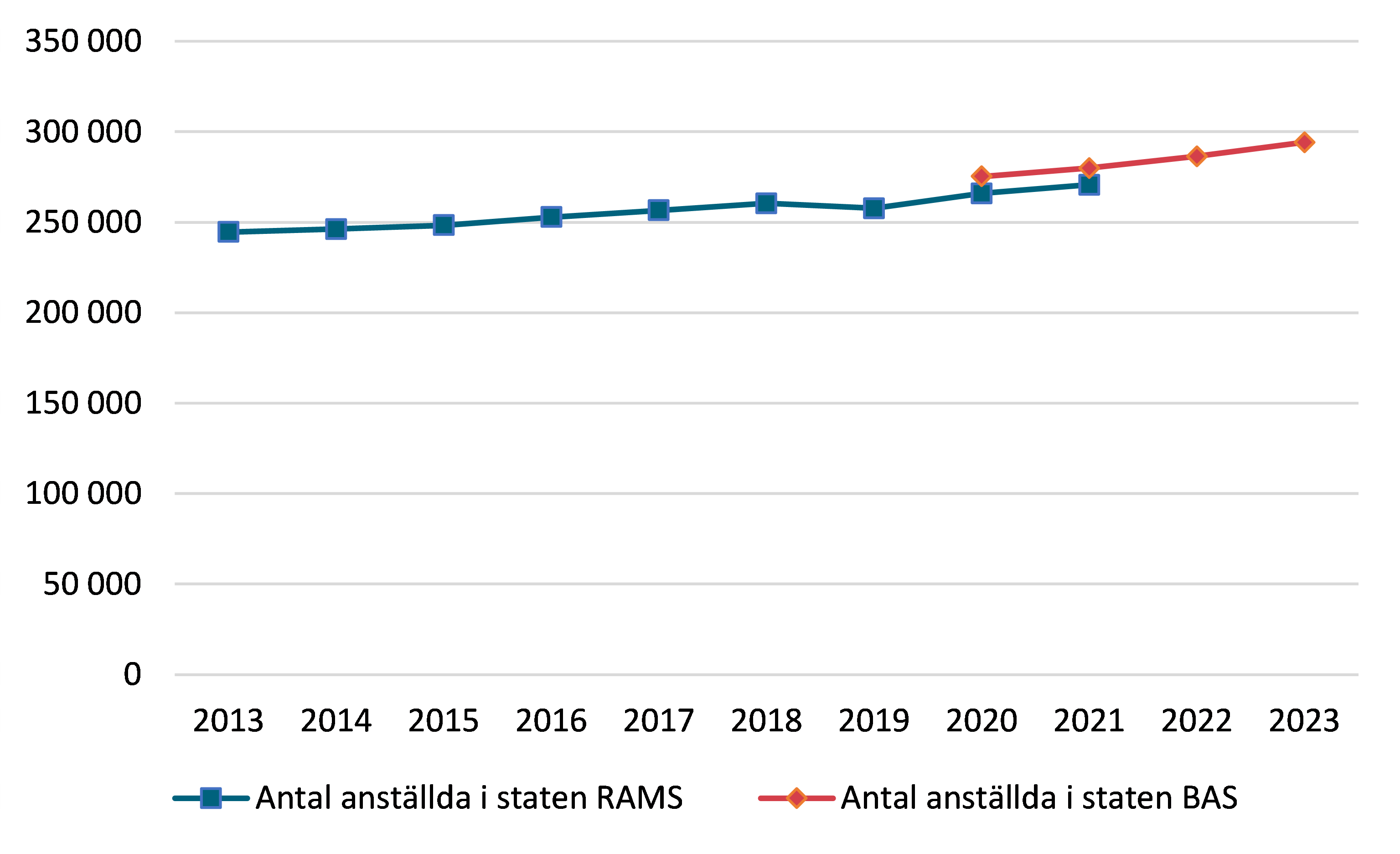SCB har ersatt den registerbaserade arbetsmarknadsstatistiken (RAMS) med statistikprodukten Befolkningens arbetsmarknadsstatus (BAS). I RAMS finns statistik fram till och med 2021. Statistiken som bygger på BAS finns framställd med 2020 och 2022 som första respektive senaste referensår. De årliga uppgifterna om antalet sysselsatta i staten och övriga sektorer är högre i BAS jämfört med RAMS. För mer information, se SCB (2023). Skillnader mellan RAMS och BAS årsregister.