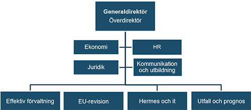 Myndigheten är organiserad i fyra avdelningar och fyra stödenheter. I ledningsgruppen ingår generaldirektören, överdirektören och avdelningscheferna.